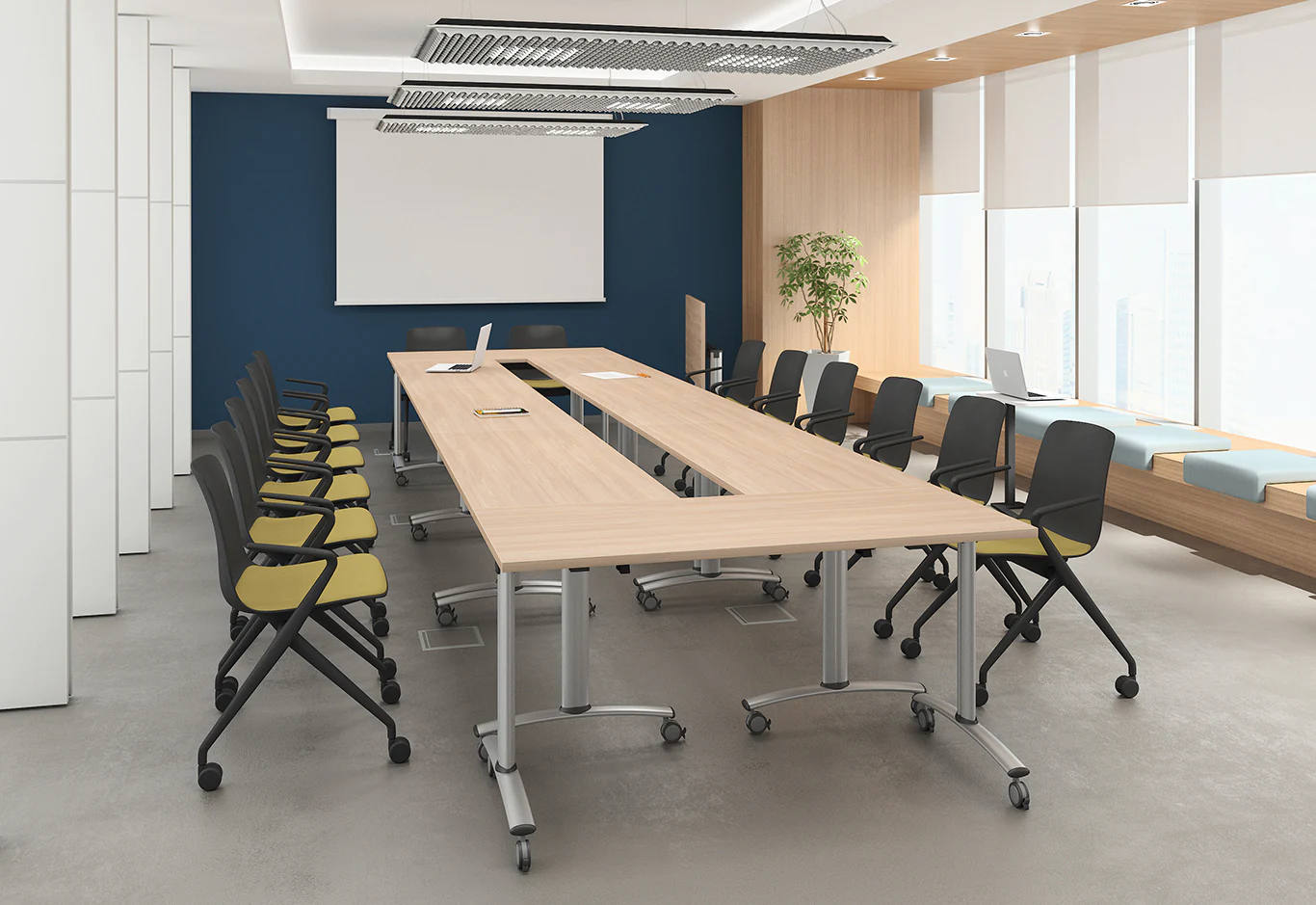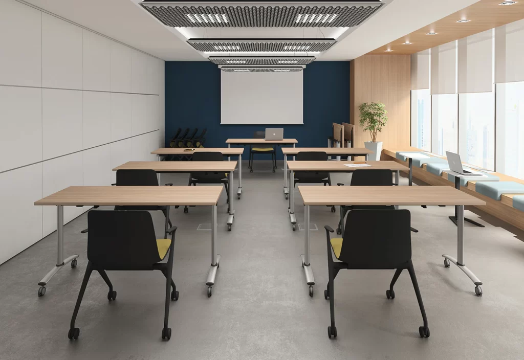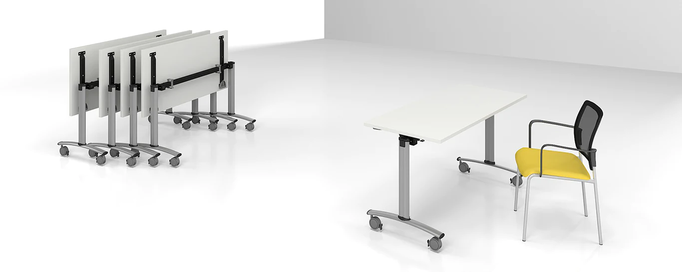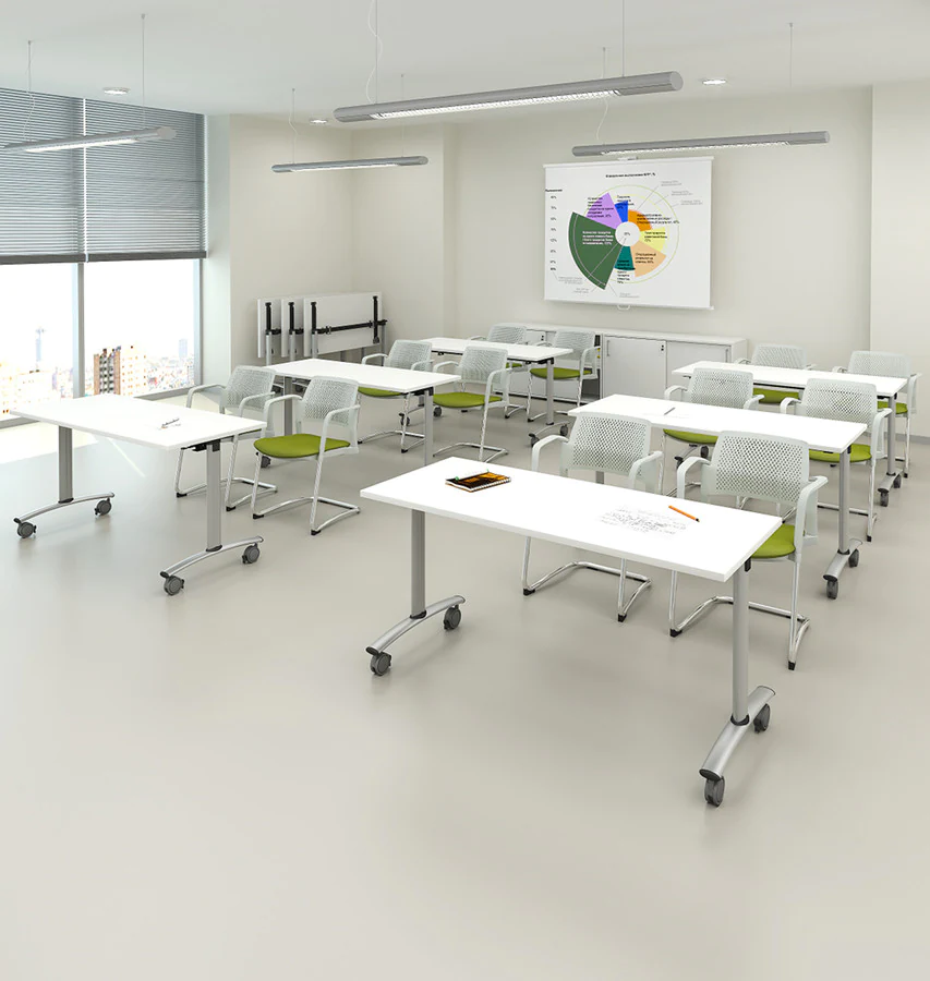 A practical solution for conference rooms, training centers, seminars, organization of temporary jobs. Simple reliable design. Beam frame on i-shaped metal supports. Wheels with lock.