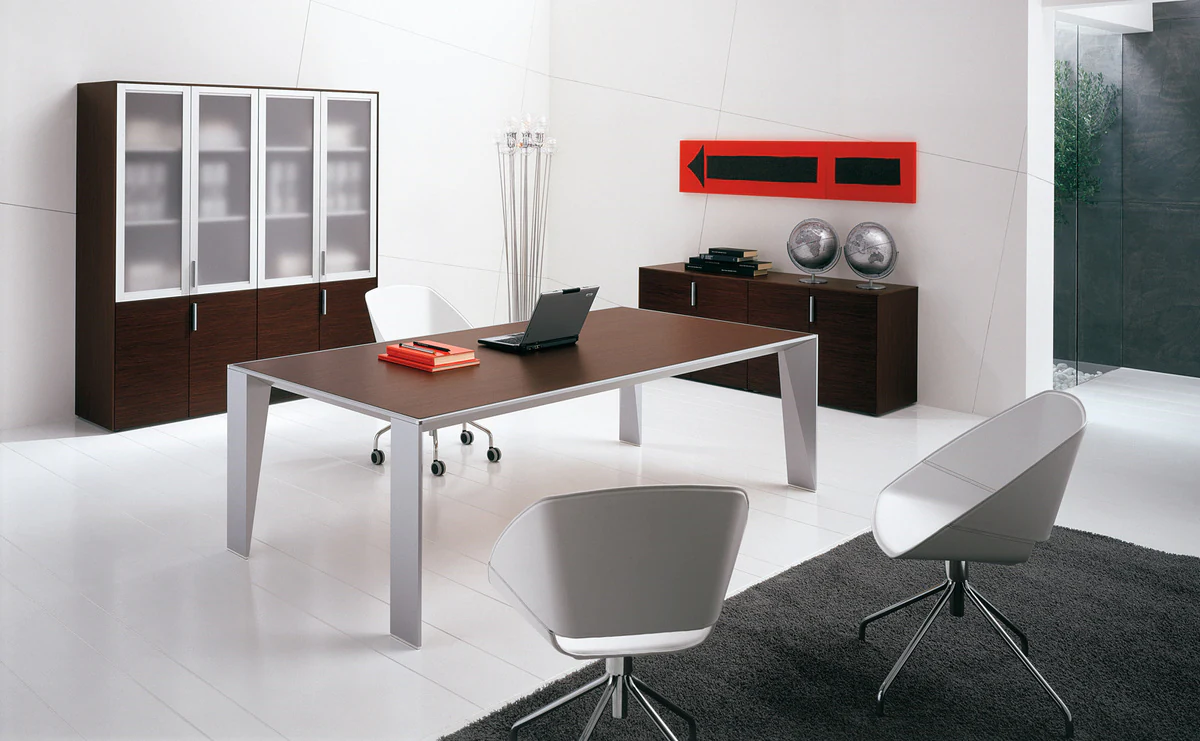 A combination of sophisticated design and research in innovative materials. Graceful profiled aluminum legs are harmoniously combined with open-pore veneer surfaces of light and dark tones.