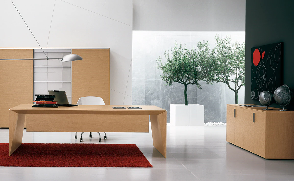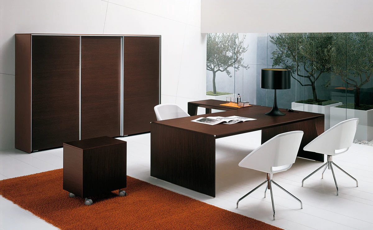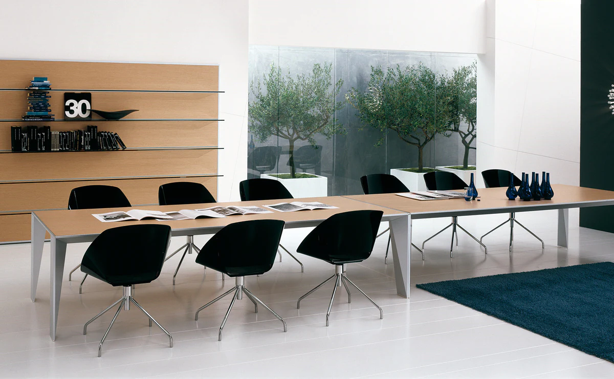 A combination of sophisticated design and research in innovative materials. Graceful profiled aluminum legs are harmoniously combined with open-pore veneer surfaces of light and dark tones.