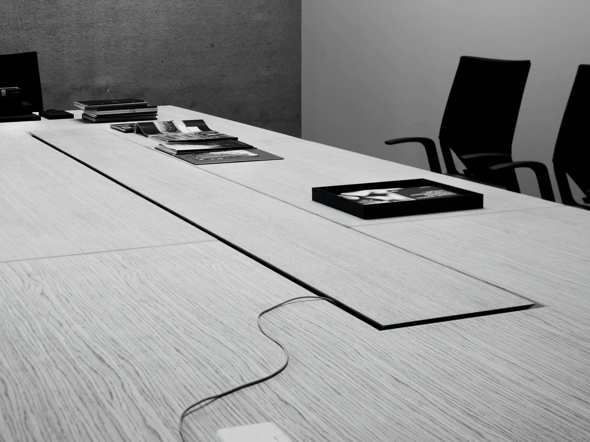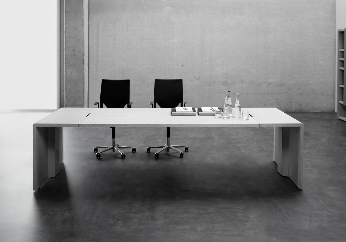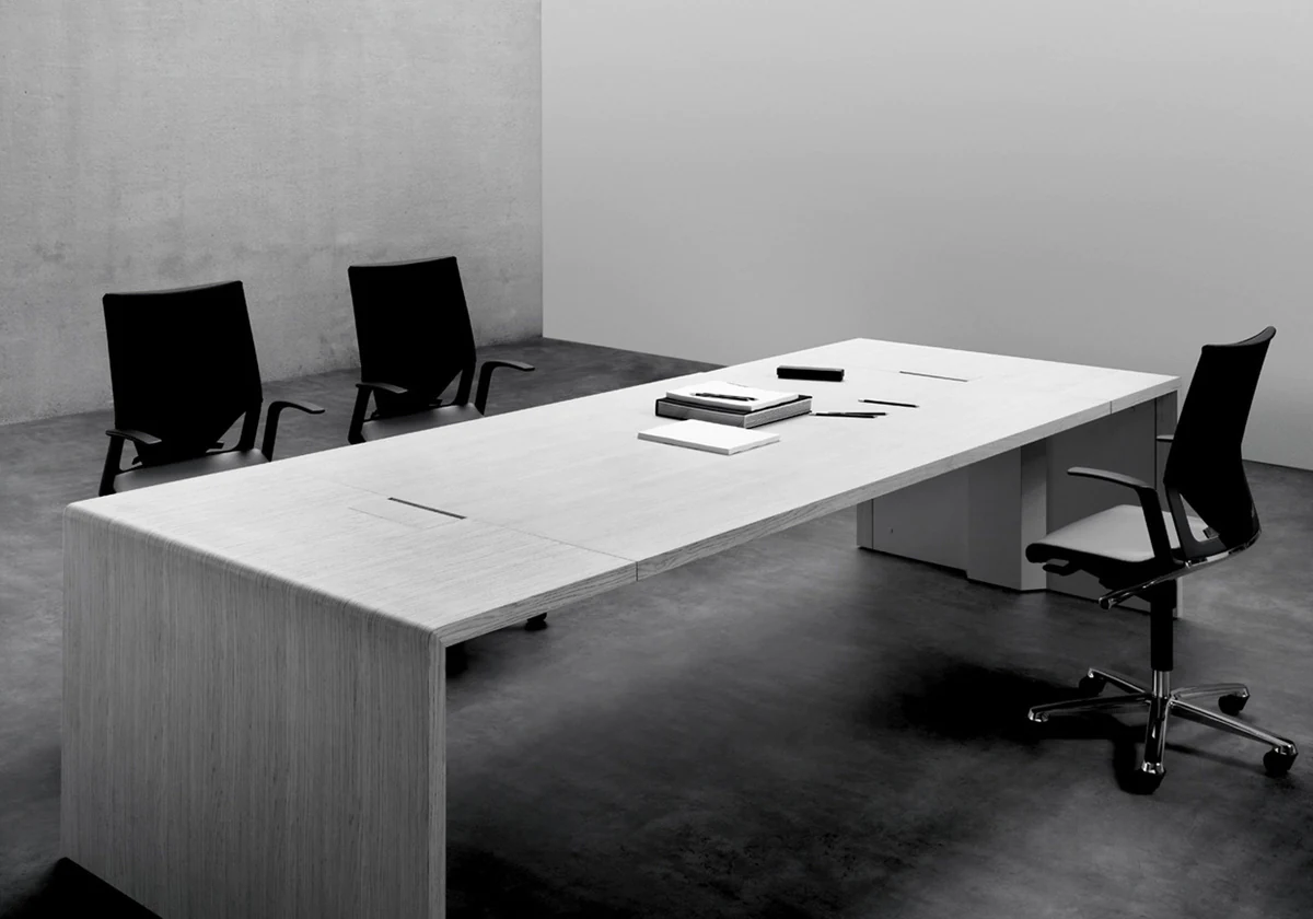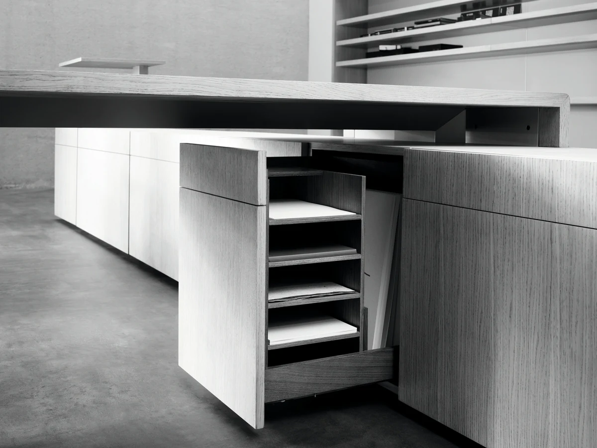 A collection of executive furniture, the modular design of which allows the modern workplace to be optimally organized. The h-shaped desktop, reminiscent of a catamaran, reveals the philosophy of teamwork, in which interaction with colleagues and office guests is the starting point.