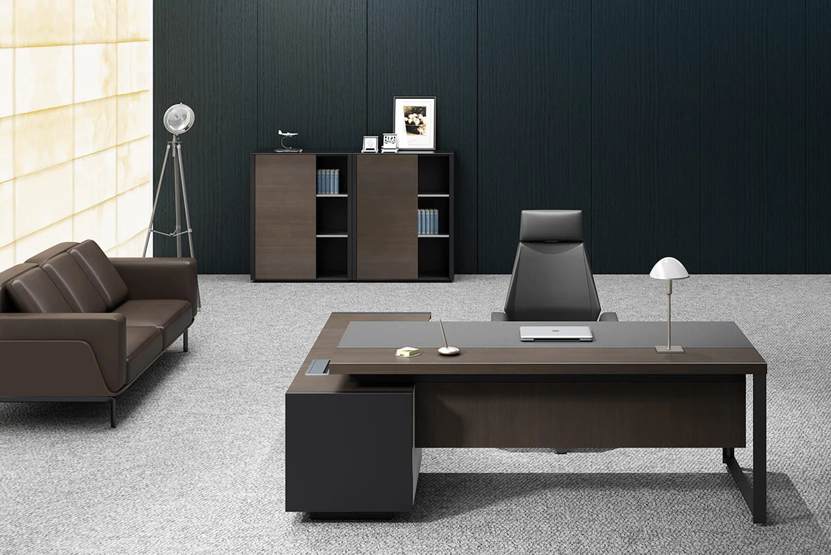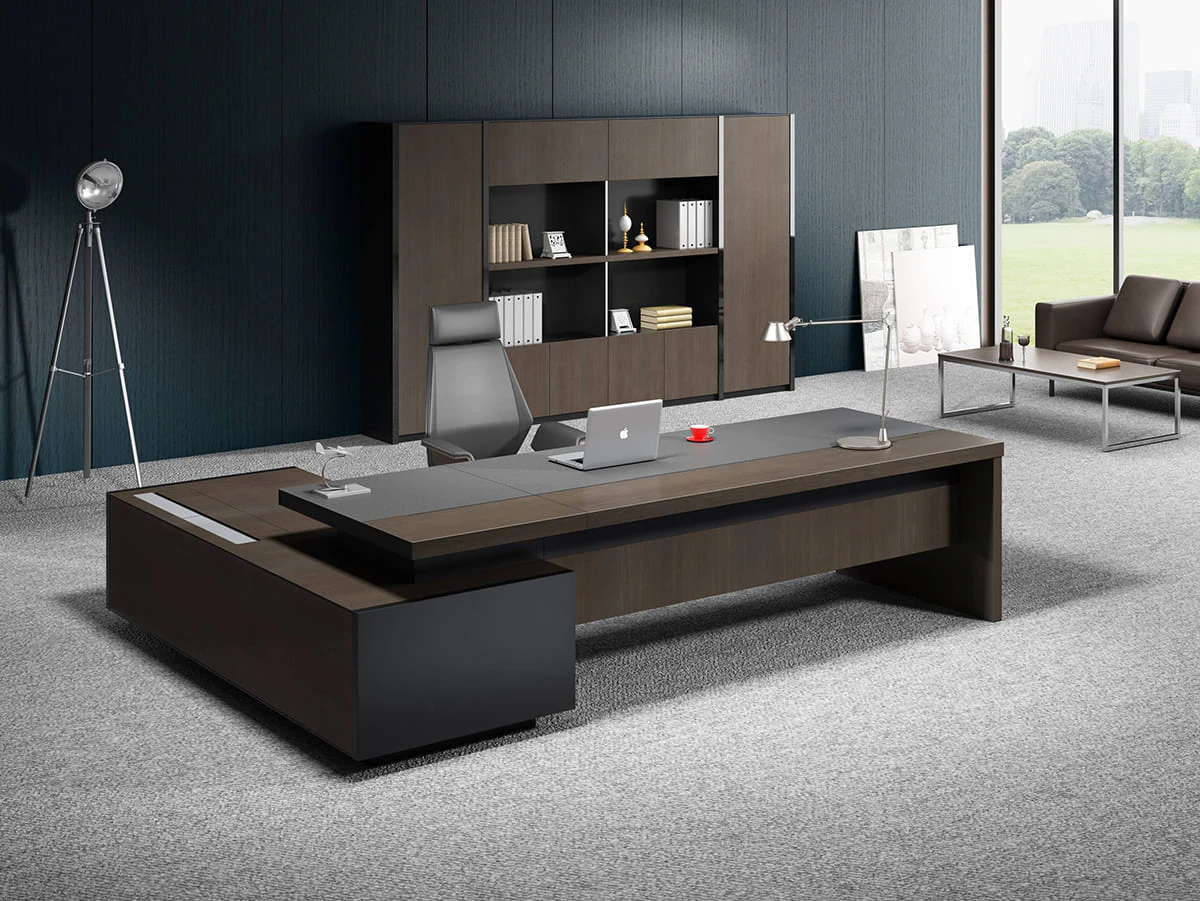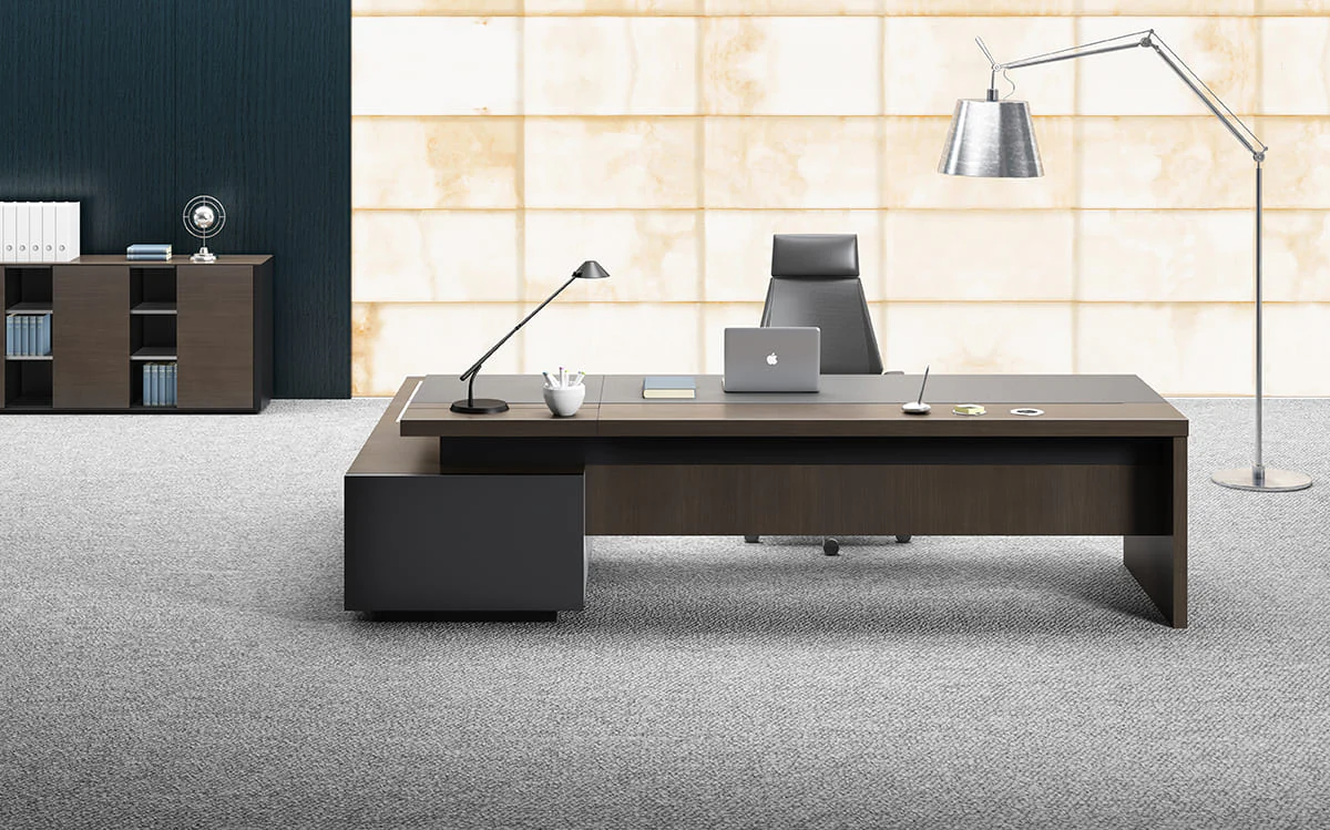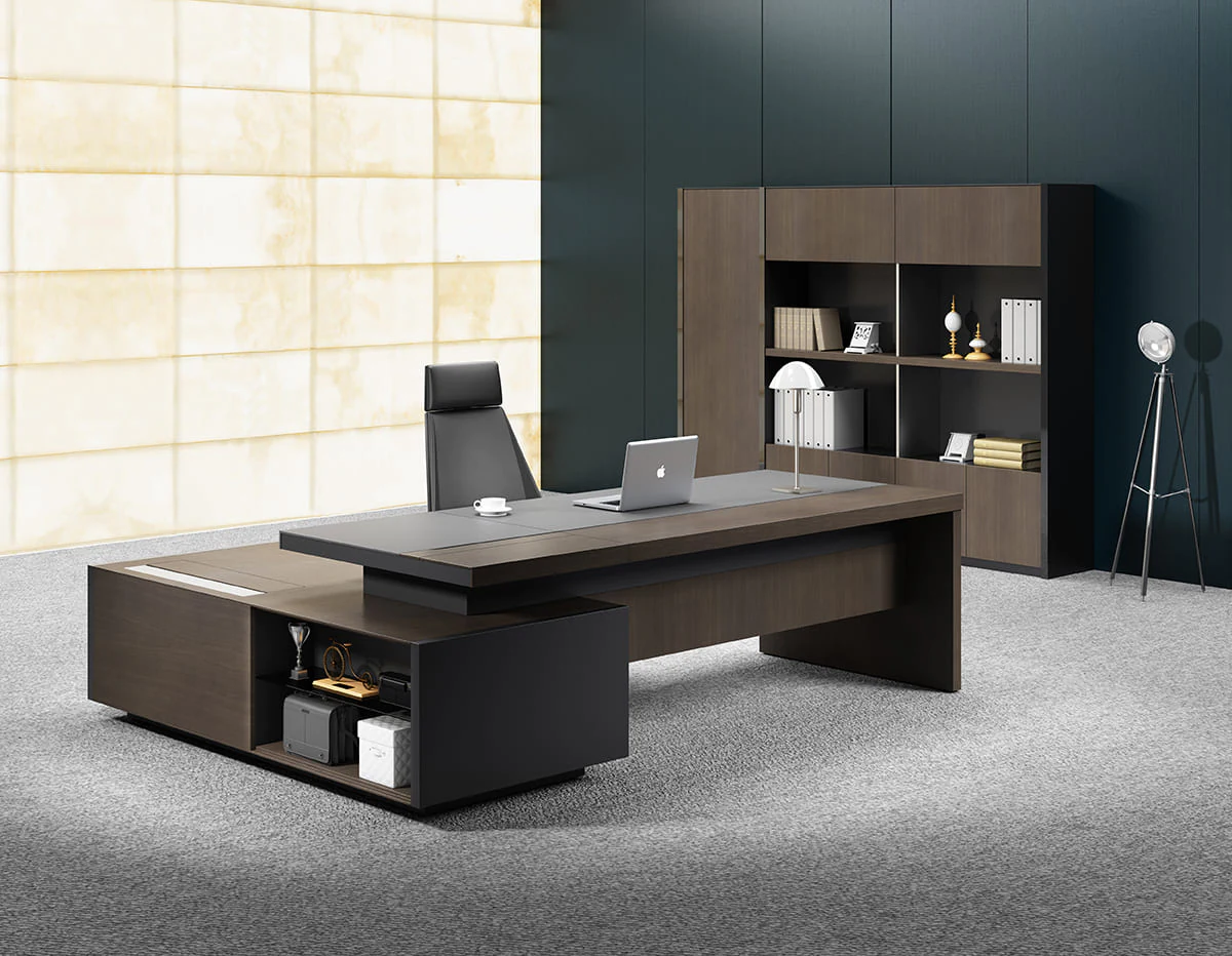 the desktop is equipped with a massive service pedestal with a large storage space and a cable management system for the output of electrical wiring. Side drawers with electronic lock provide convenient and secure storageany things. Invisible handles maintain the overall clean-line design.