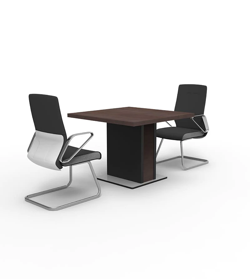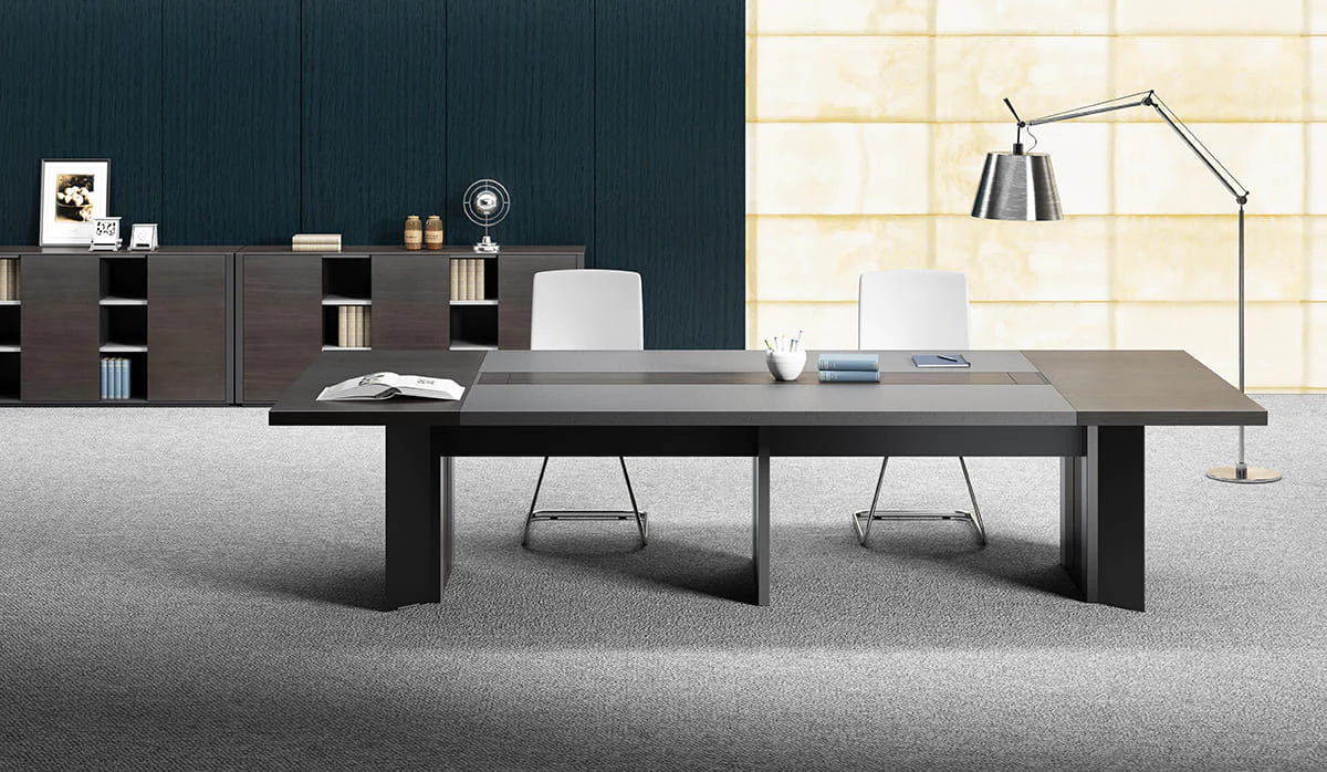 the larry line includes offices and meeting tables in an exquisite combination of natural walnut veneer , gray leather and metal . The combination of contrasting shapes and materials is emphasized by a solid, laconic design.