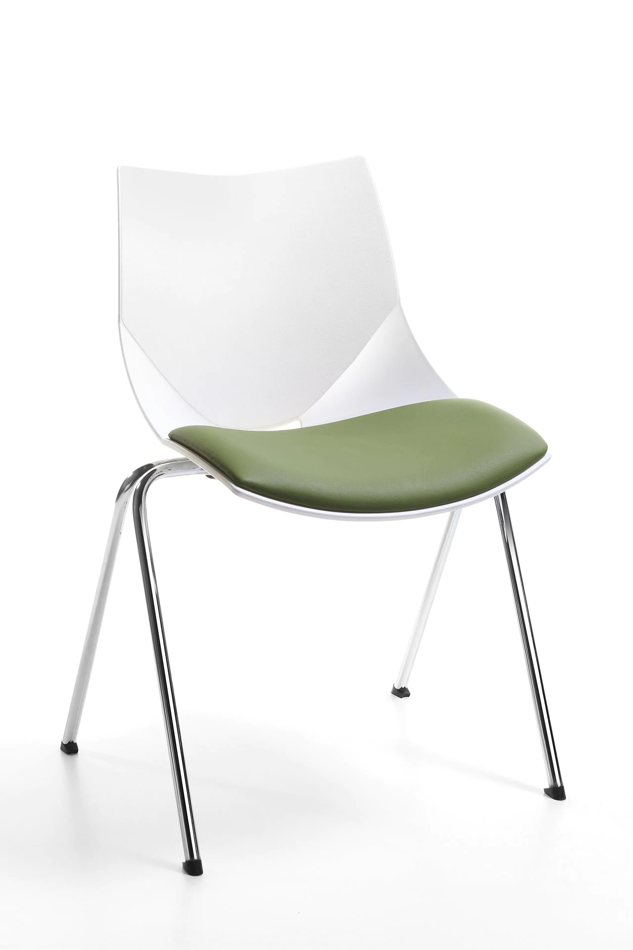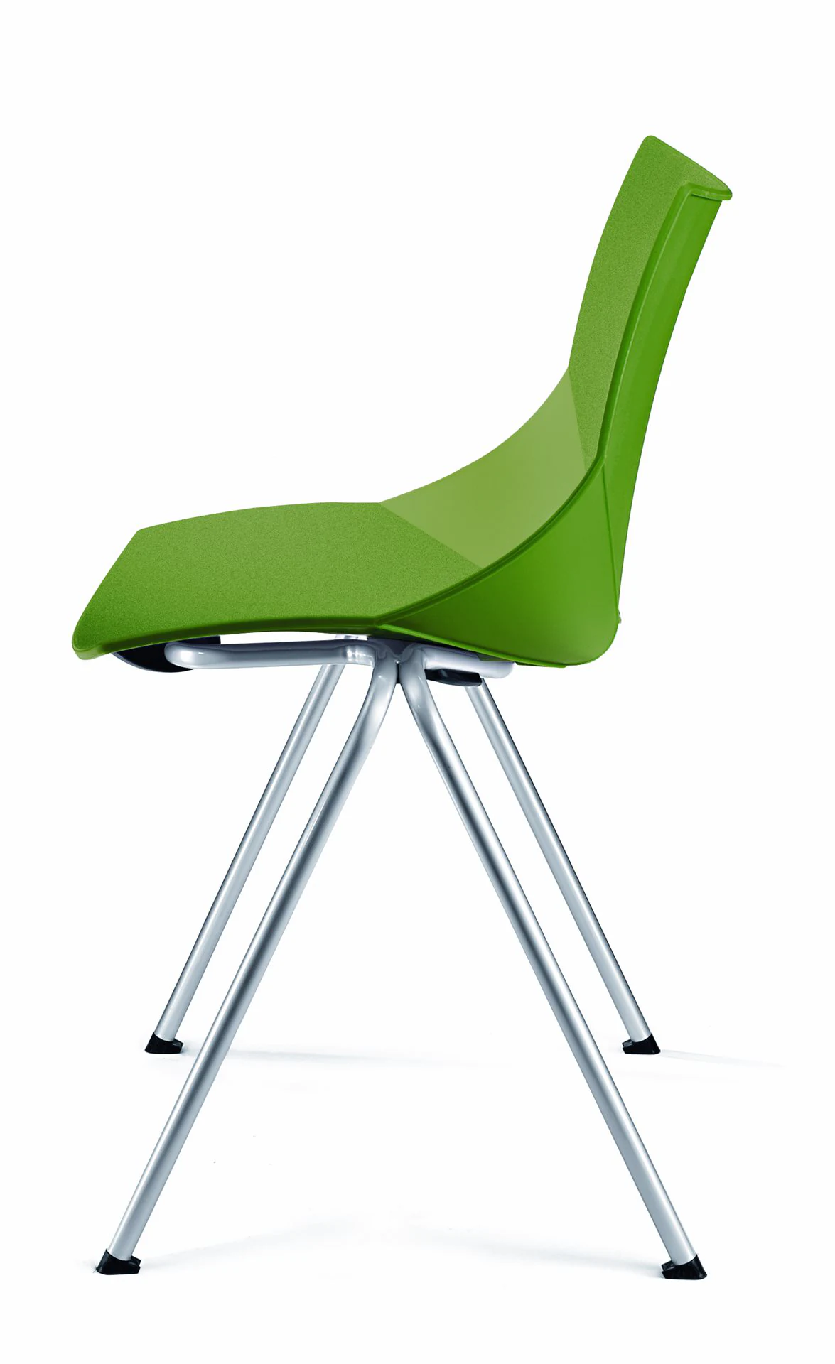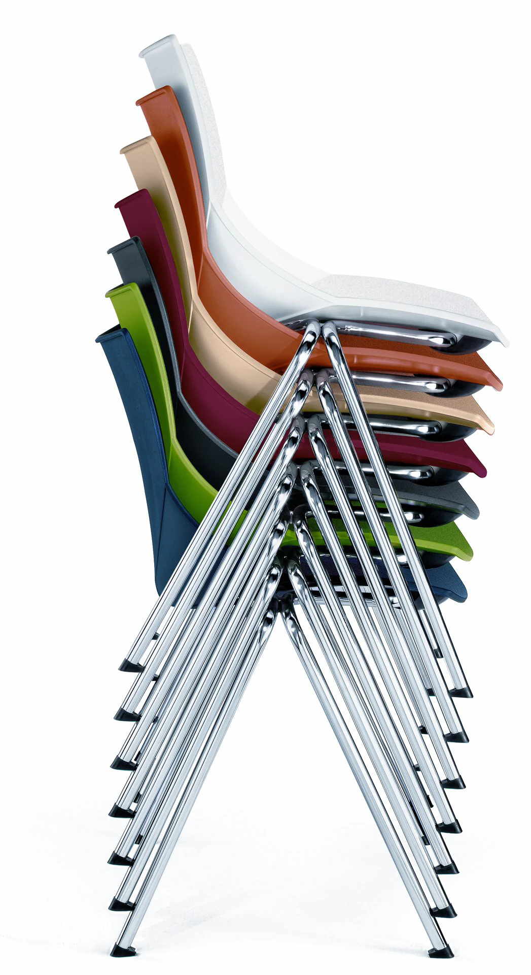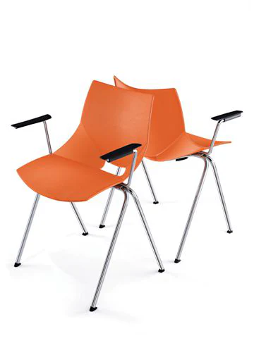 Chrome-plated frame on 4 legs. The case of original design from polypropylene. Fabric upholstery of a seat (option). Stackable (up to 8 pieces). Armrests, a writing table, a set of plates for connecting chairs in rows, a trolley for transporting chairs – optional.
