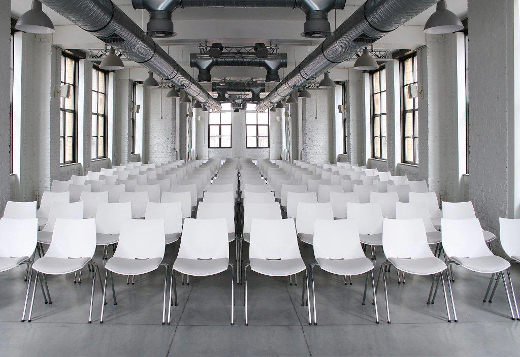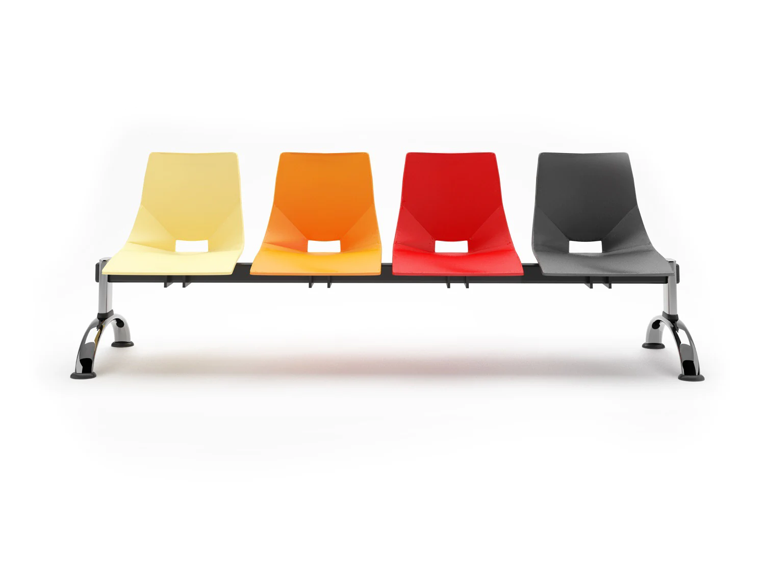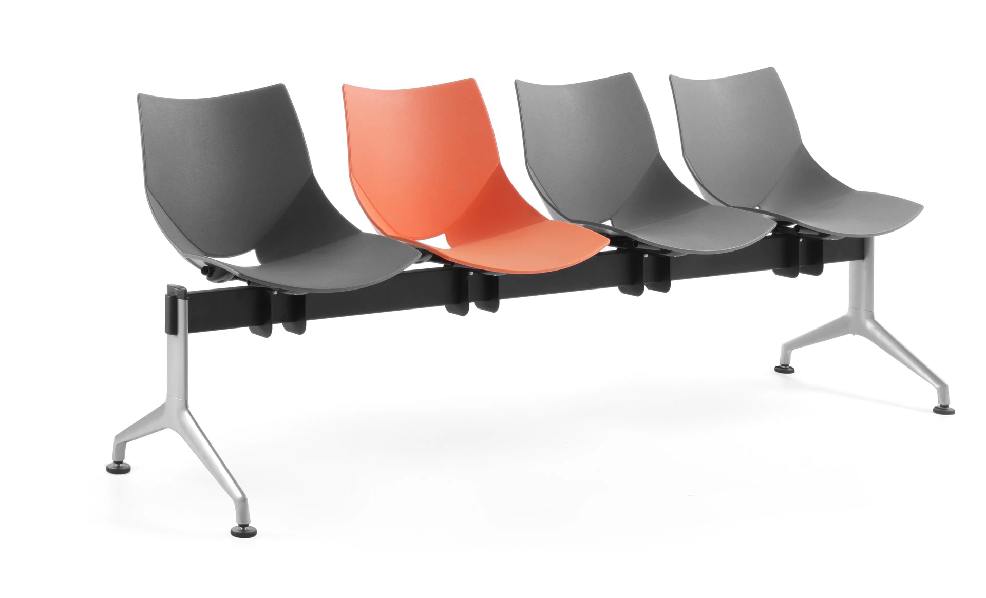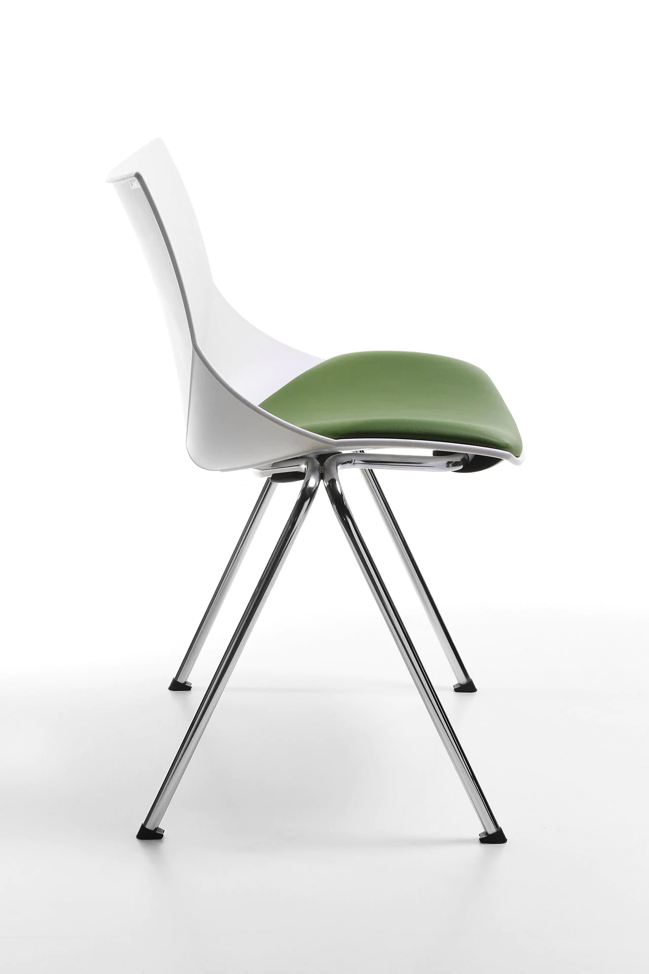 Chrome-plated frame on 4 legs. The case of original design from polypropylene. Fabric upholstery of a seat (option). Stackable (up to 8 pieces). Armrests, a writing table, a set of plates for connecting chairs in rows, a trolley for transporting chairs – optional.