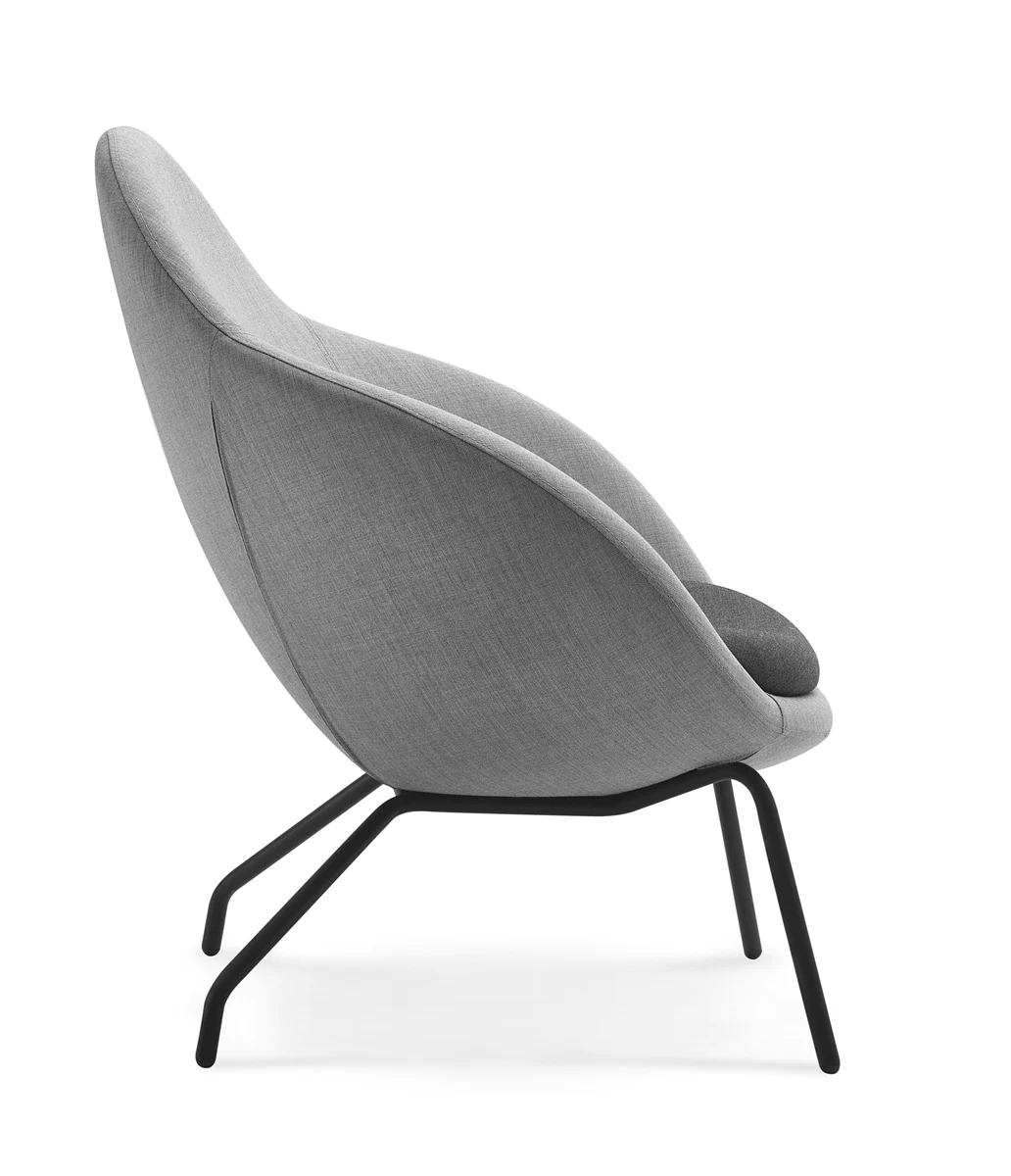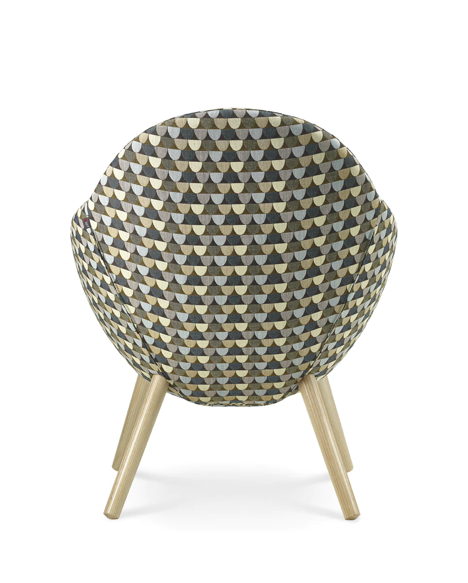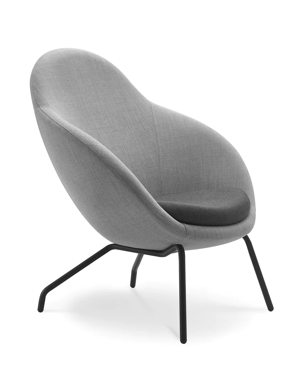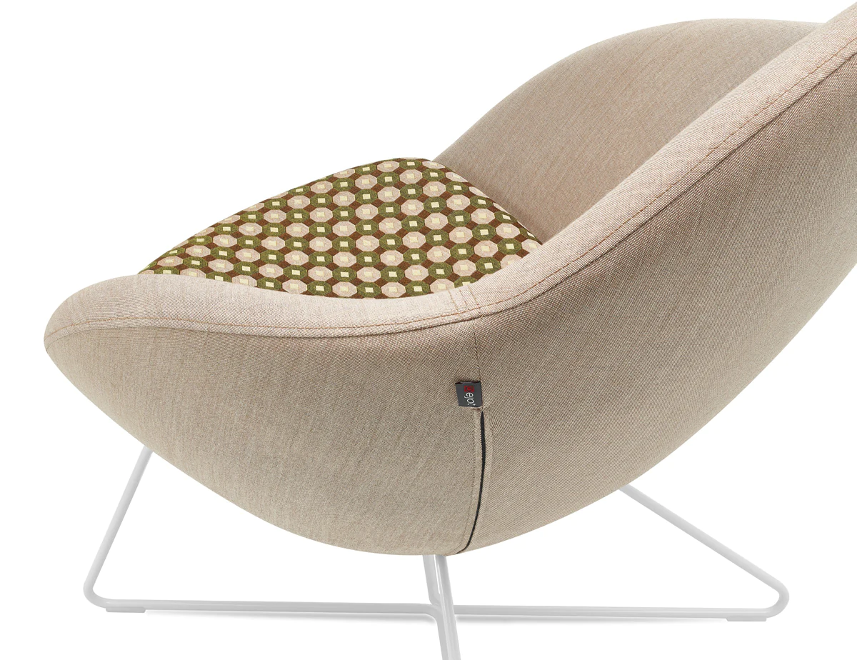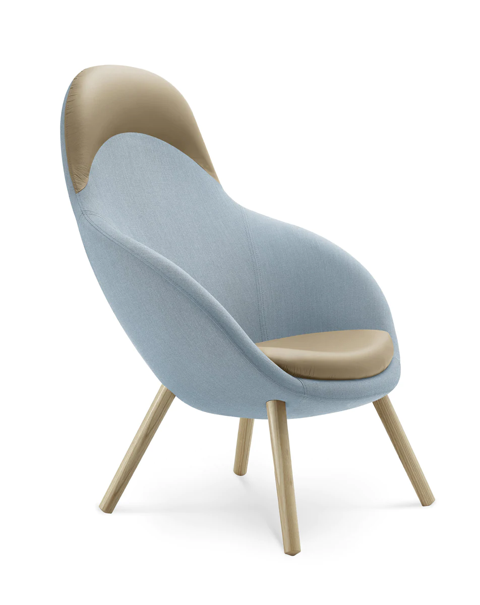 4 types of legs: metal legs or skids (powder-coated or chrome), solid ash wood legs (3 finishes) and skids. Various upholstery materials and colors.